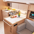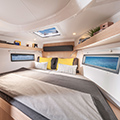 A V-alakú orrnak köszönhetően a fedélzet alatt több hely vanaz orrkabinban. És az orr-résznek köszönhetően tervezőink a nagyméretű hátsó kabinokat egy kicsit hátrébb tudták elhelyezni. Mindkét szempont előnyös a szalonban, így hét személy kényelmesen élvezheti a vacsorát a szalonasztalnál. Az orrban található tágas tulajdonosi kabinban a franciaágy mérete szenzációs, 1,73 m x 2 m.